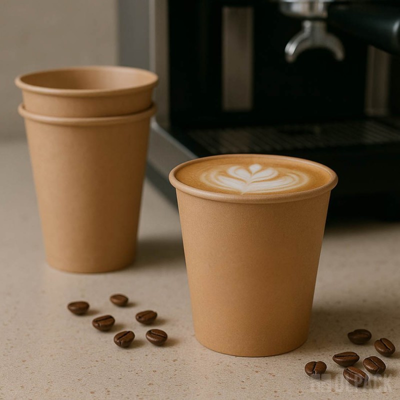 Naturalny brązowy kolor kraft, kubków z papieru, podkreśla styl „eco” i świetnie komponuje się z każdym wystrojem i brandingiem.