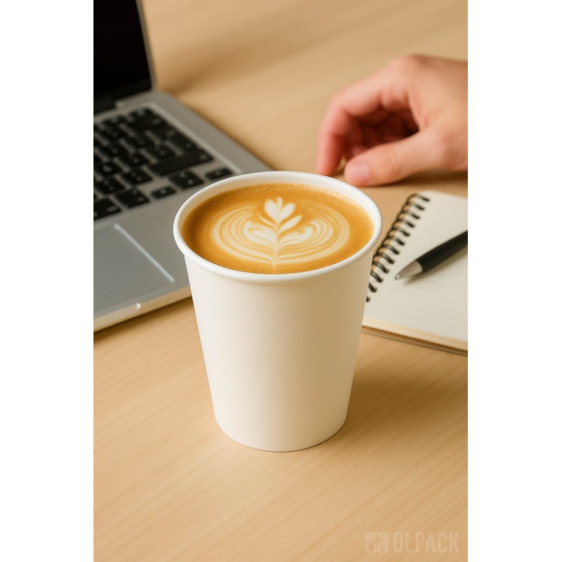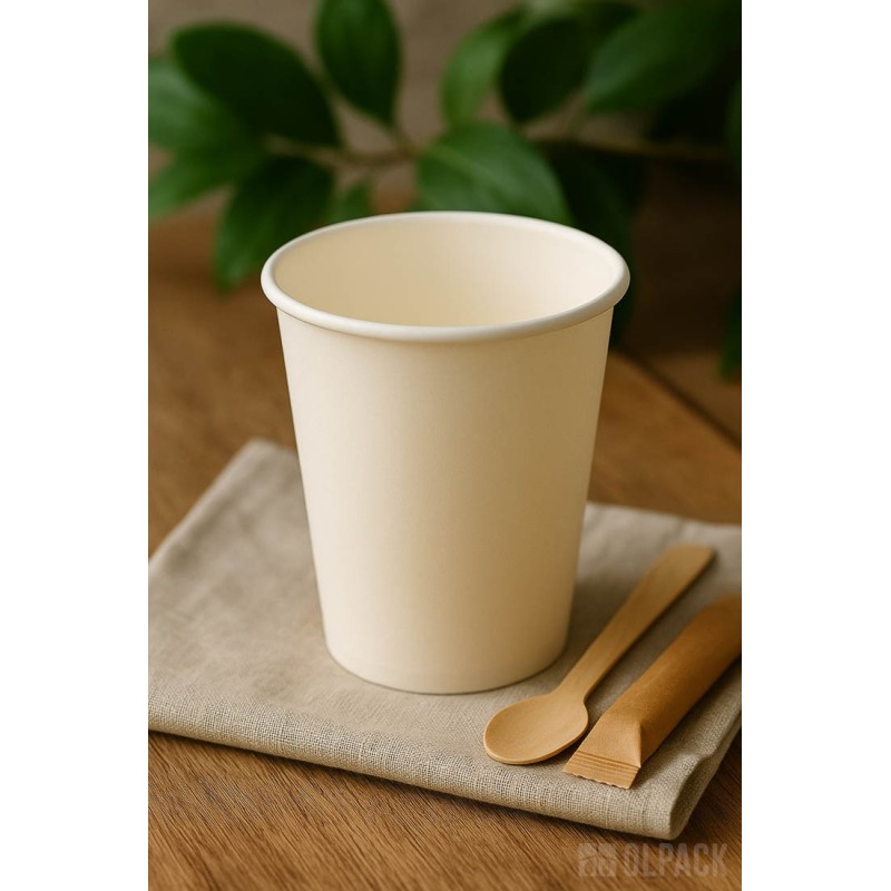 Kubeczki papierowe 350 ml Olpack są wykonane w 100% z papieru i nie zawierają powłoki PE, ponieważ zabezpieczone są ekologiczną dyspersją wodną. Dzięki temu nie podlegają opłacie SUP, są biodegradowalne, recyklingowalne.