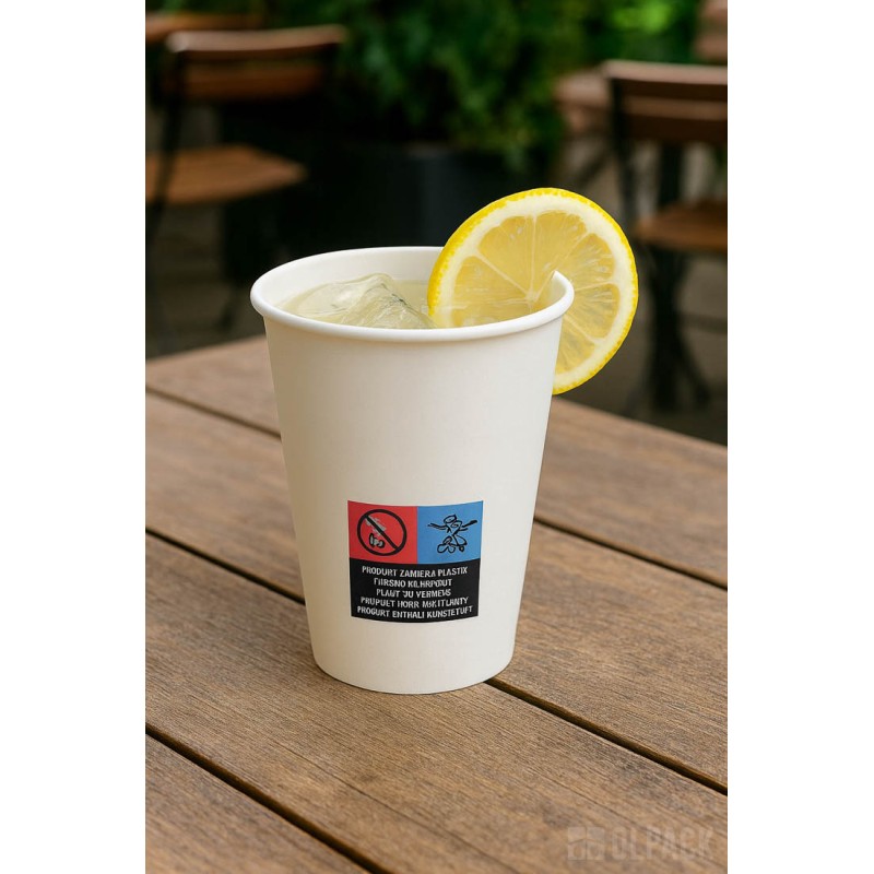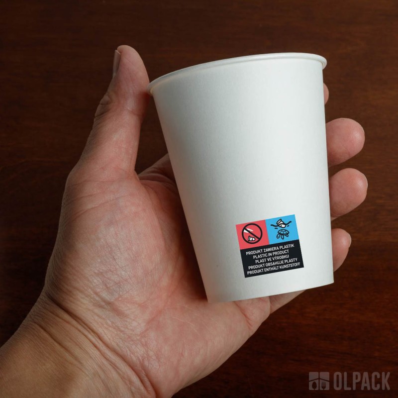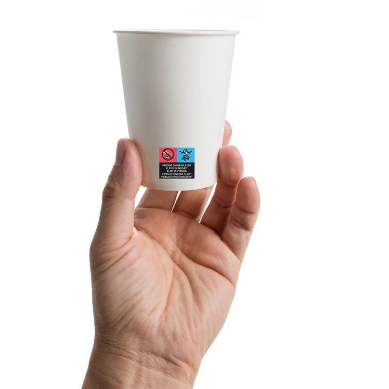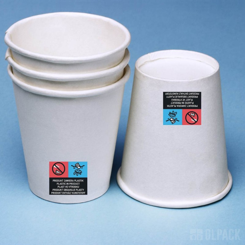 Kubeczki jednorazowe papierowe białe są wykonane z papieru jednowarstwowego z wewnętrzną warstwą PE zapewniającą szczelność i odporność na przeciekanie. Kubki z papieru z PE - oznakowane zgodnie z dyrektywą SUP – obowiązkowy piktogram „Zawiera plastik” (żółw). Produkt w 100% recyklingowany, zgodny z europejską dyrektywą dotyczącą ograniczenia plastiku