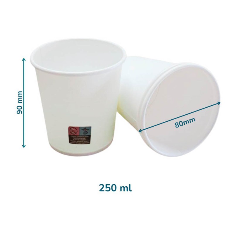 Pojemność 250 ml, średnica górna 80 mm, wysokość typowa dla jednościennych kubków; kompatybilne są wieczka 80 mm,