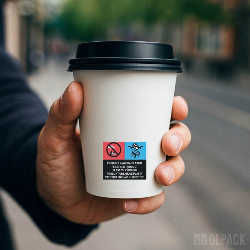 ✔ znakowanie SUP: piktogram „Zawiera plastik” (żółw) + informacja tekstowa
