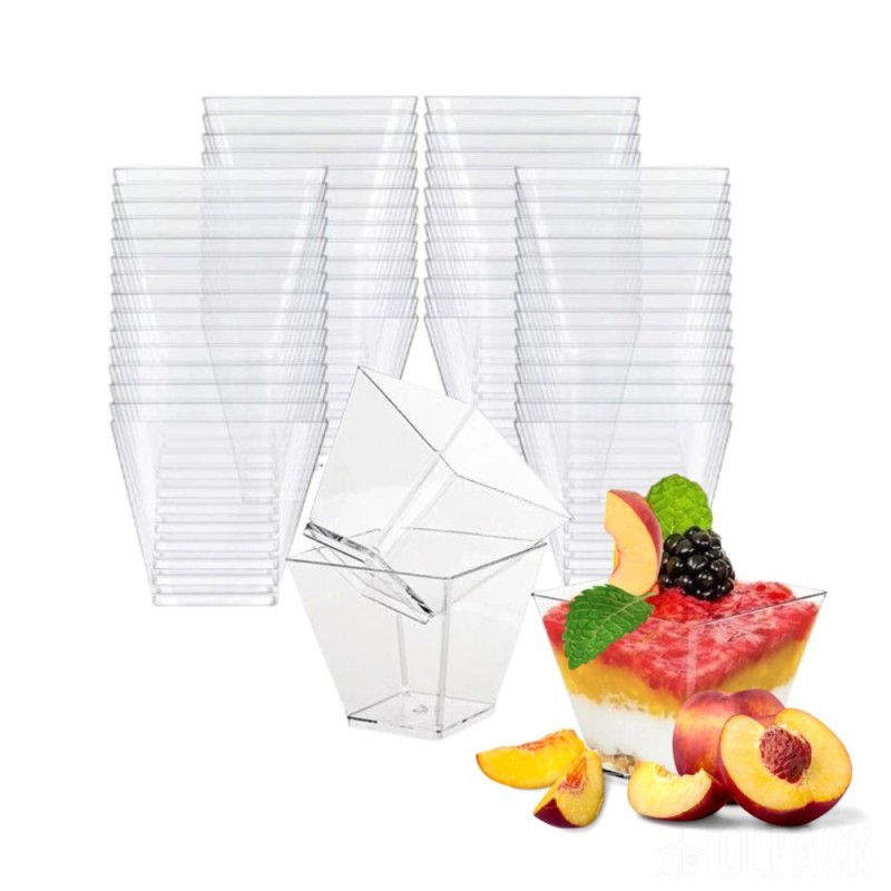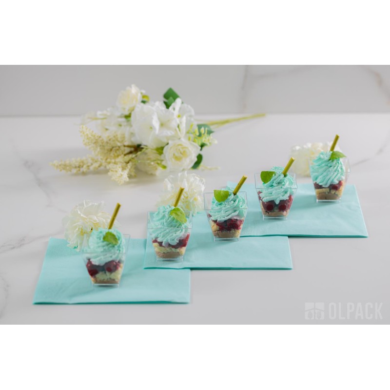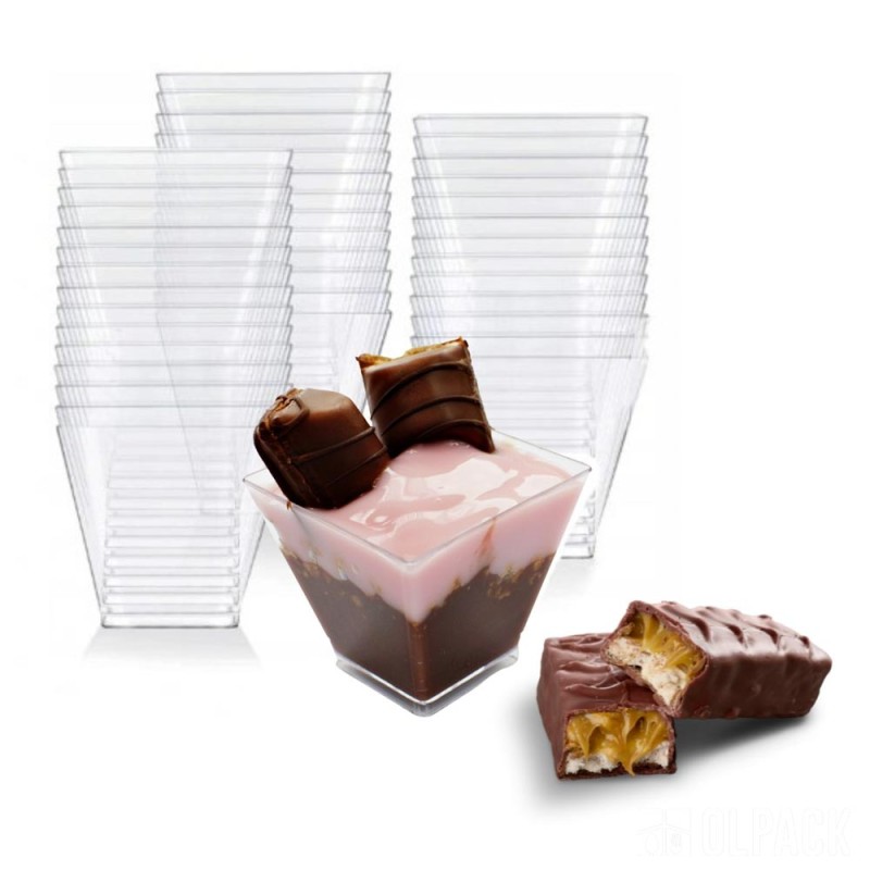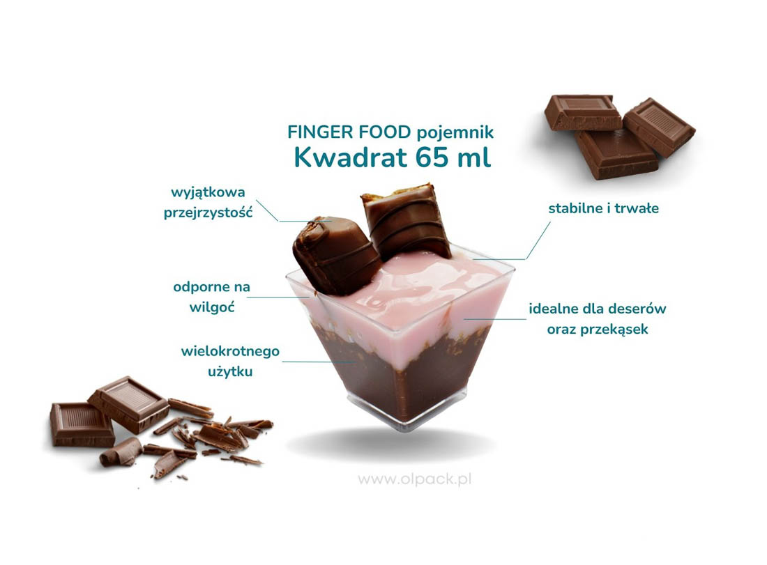 Przezroczyste pucharki pojemniczki kwadratowe 60 ml to praktyczne rozwiązanie dla cukierni, kawiarni, restauracji, hoteli i firm cateringowych. Firma Olpack oferuje również akcesoria idealnie dopasowane do plastikowych pojemników deserowych: pokrywki, zestawy pojemniczek + pokrywka + łyżeczka, a także - drewniane łódeczki na przekąski oraz ozdobne patyczki do koreczków.