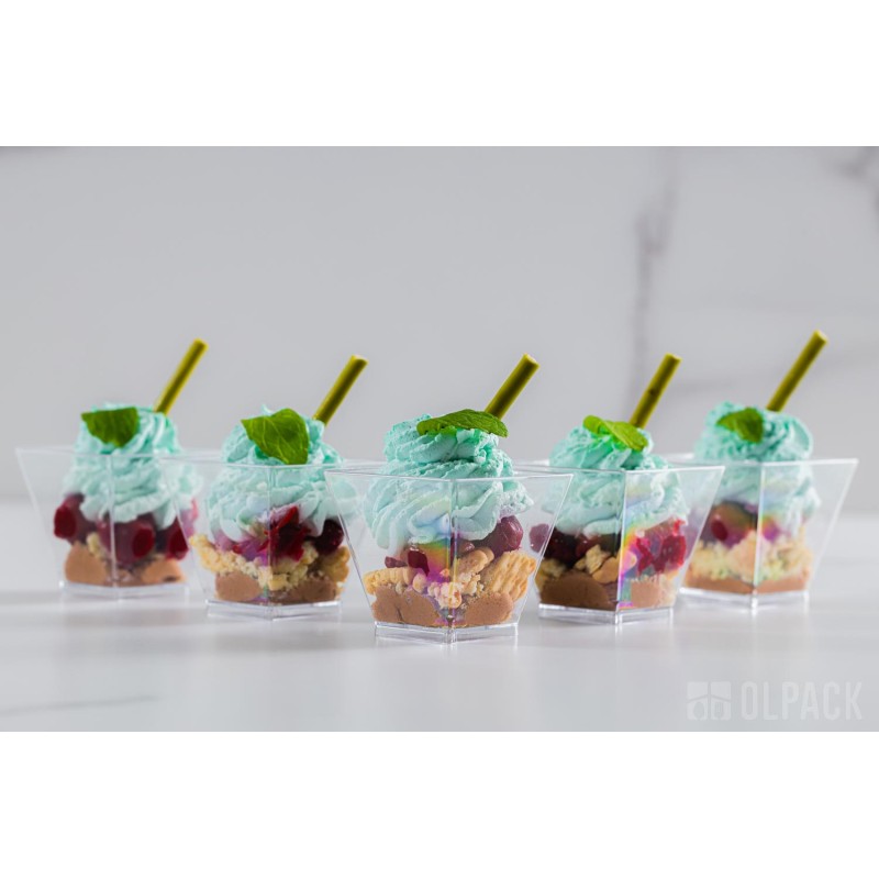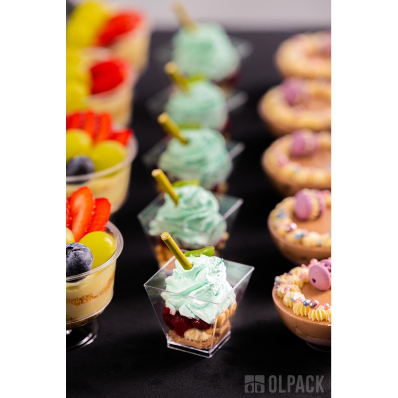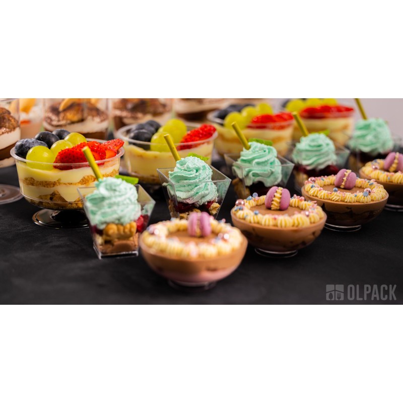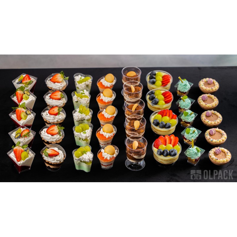 Pojemniczki deserowe Olpack są projektowane przede wszystkim do zimnych i chłodzonych deserów oraz potraw o temperaturze pokojowej (musy, kremy, panna cotta, tiramisu, sałatki, przekąski finger food).
