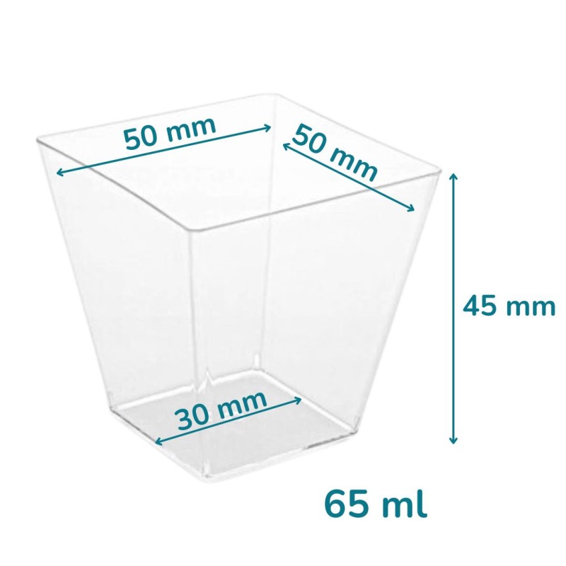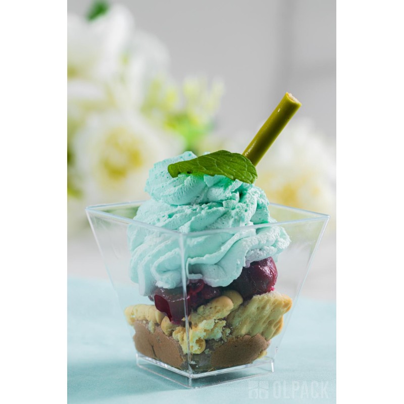 Pojemniczek deserowy kwadratowy 60 ml wykonany jest z wysokiej jakości polistyrenu (PS). To mały, plastikowy pojemnik degustacyjny, sztywny, przejrzysty i szkłopodobny, dzięki czemu bardzo dobrze eksponuje zawartość. Kwadratowy kształt sprawia, że pojemniczek idealnie nadaje się do mini deserków, musów, kremów, sosów, dipów, przystawek i przekąsek typu finger food.