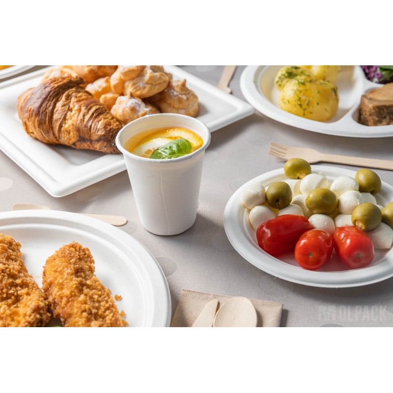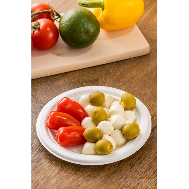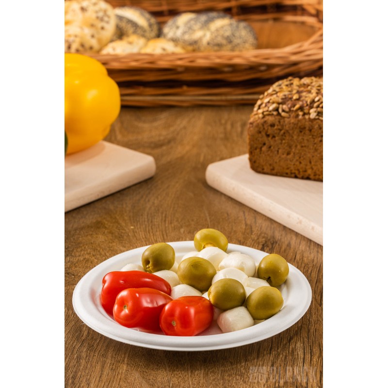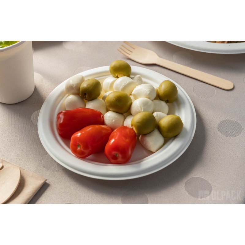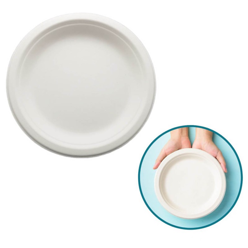 Jednorazowe talerzyki z pulpy trzciny cukrowej o średnicy 180 mm (50 szt.). Doskonałe na wszelkie okazje. Idealnie pasują przystawki oraz desery