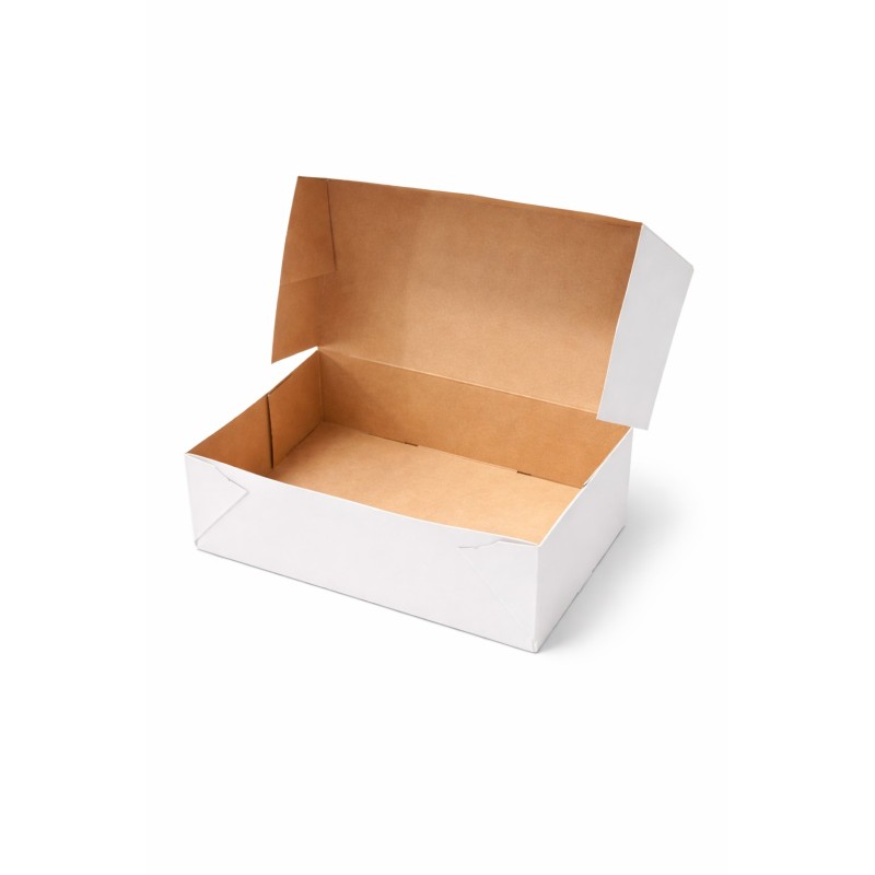 Opakowanie jest łatwe i szybkie w składaniu, a po złożeniu prezentuje się w klasycznym, białym kolorze z naturalnym, brązowym wnętrzem. Zamykana klapa stabilnie zabezpiecza zawartość, dzięki czemu karton sprawdzi się w cukierniach, kawiarniach, piekarniach oraz cateringu.
