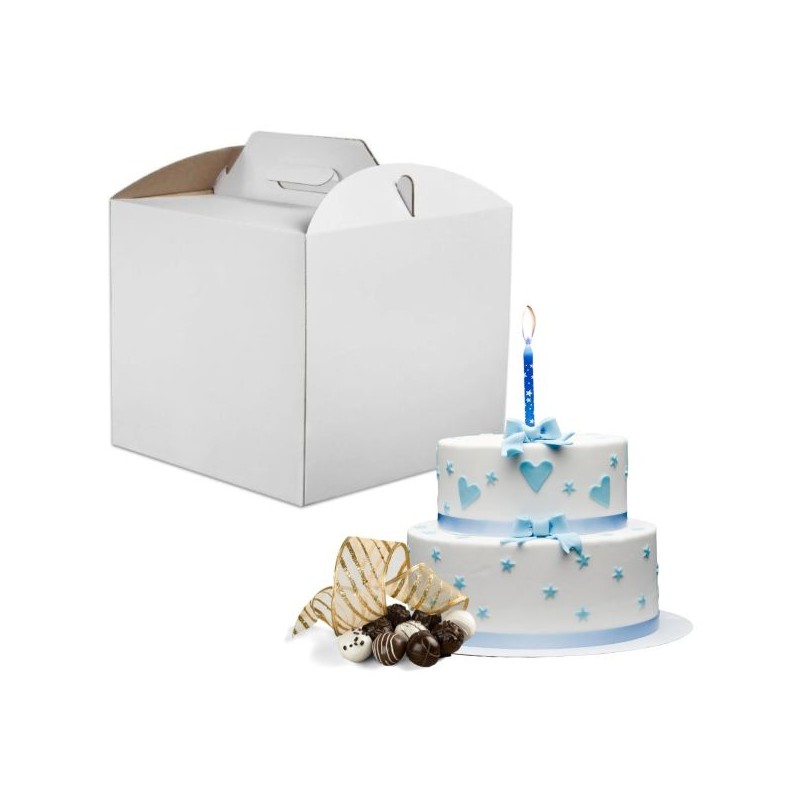 Karton cukierniczy typu koszyk 32×32×28 cm to solidne i pojemne opakowanie cukiernicze, przeznaczone do bezpiecznego pakowania oraz transportu dużych tortów i efektownych wypieków. Wykonany z trwałego papieru karton cukierniczy gwarantuje stabilność konstrukcji oraz odpowiednią ochronę produktu podczas przenoszenia.