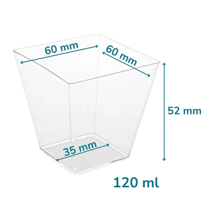 Pojemniczki deserowe kwadrat 120 ml finger food wykonane są z wysokogatunkowego polistyrenu (PS). Są sztywne, przejrzyste i szkłopodobne, dzięki czemu elegancko eksponują warstwowe desery i przekąski. Kwadratowy kształt z delikatnie zwężającymi się ściankami sprawia, że każdy plastikowy pojemniczek na mini deserki wygląda jak mały pucharek degustacyjny.