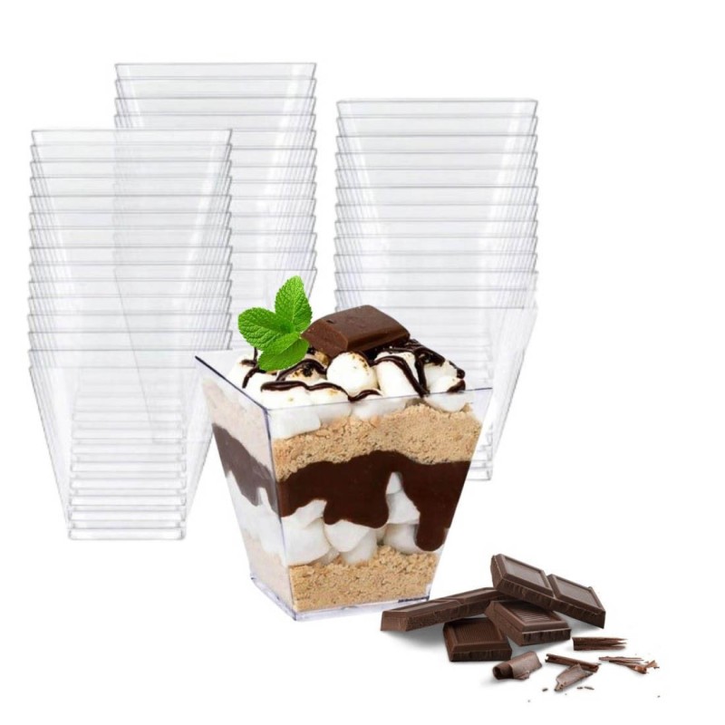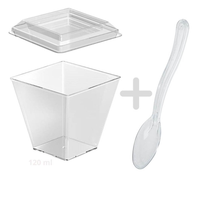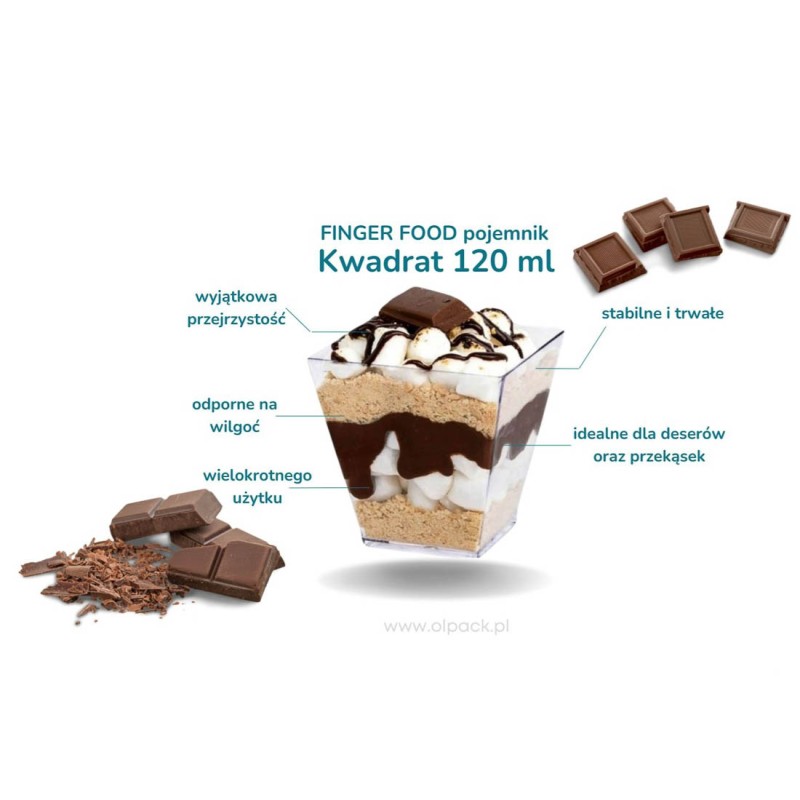Przezroczyste, plastikowe kubeczki degustacyjne kwadratowe 120 ml idealnie sprawdzają się do serwowania musów, tiramisu, panna cotty, kremów, galaretek oraz przekąsek typu finger food. Firma Olpack oferuje również akcesoria idealnie dopasowane do plastikowych pojemników deserowych: pokrywki, zestawy pojemniczek + pokrywka + łyżeczka, a także - drewniane łódeczki na przekąski oraz ozdobne patyczki do koreczków.