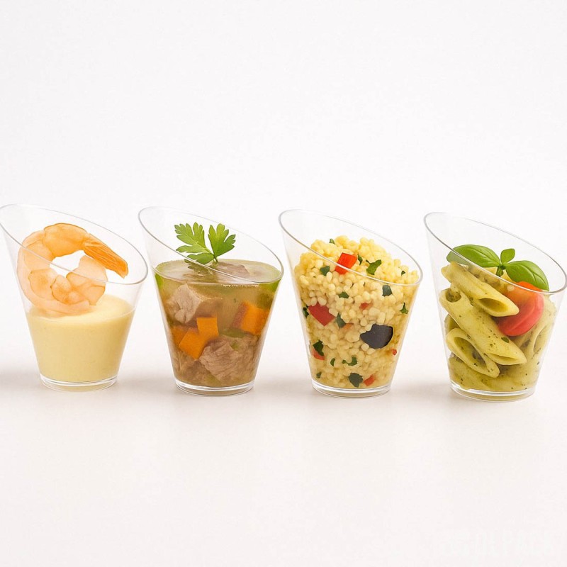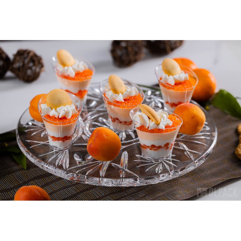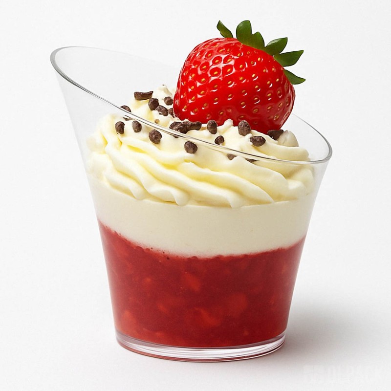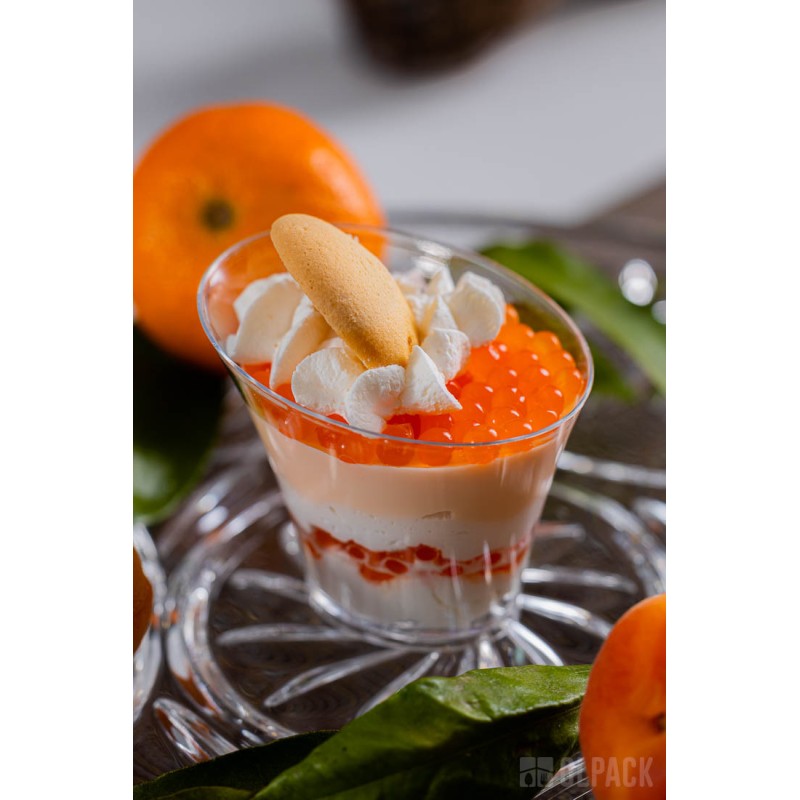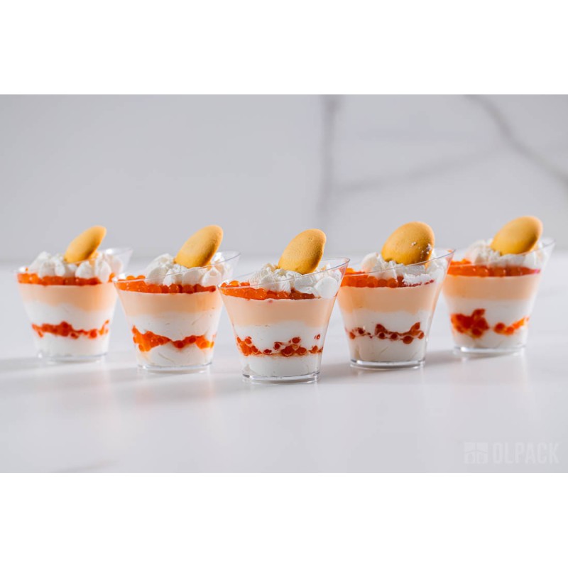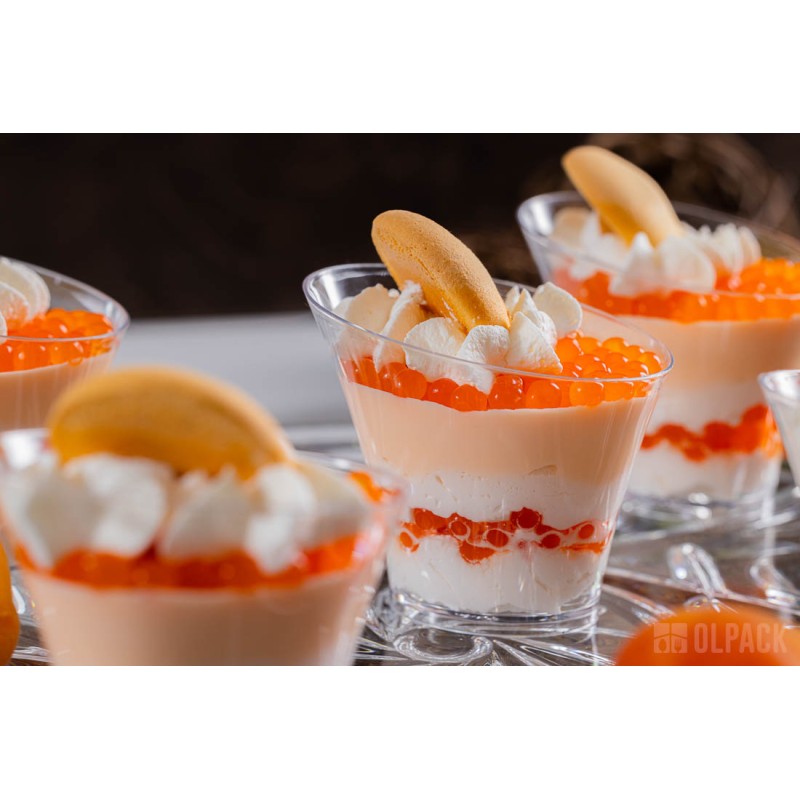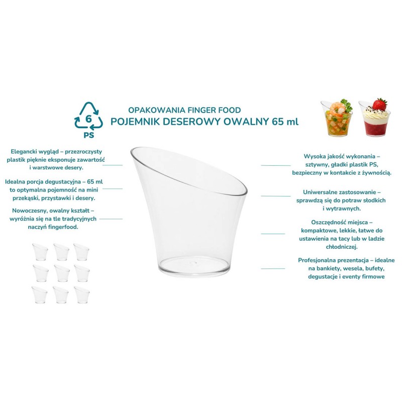 To mały plastikowy pojemniczek na mini deserki i przekąski, sztywny, transparentny i szkłopodobny, dzięki czemu bardzo dobrze eksponuje zawartość. Zastosowany polistyren (PS) jest tworzywem przeznaczonym do kontaktu z żywnością i spełnia wymagania przepisów unijnych.