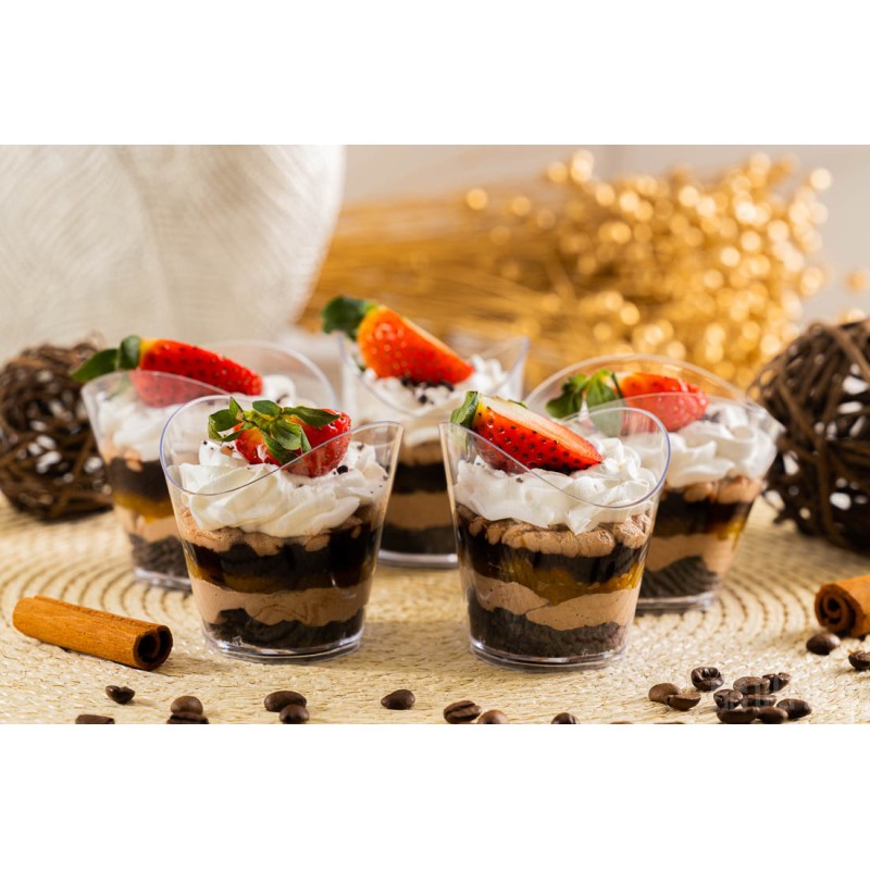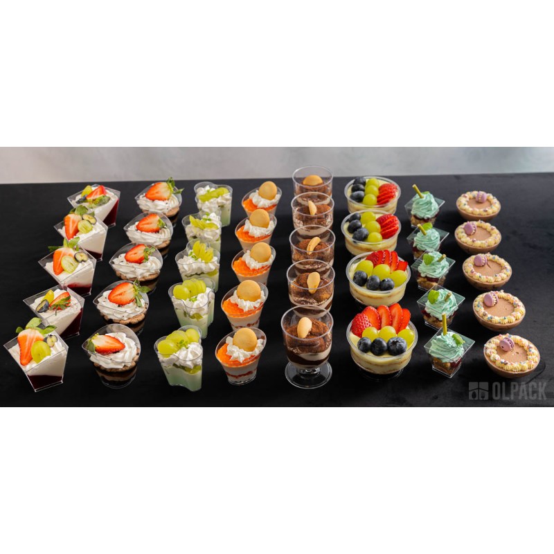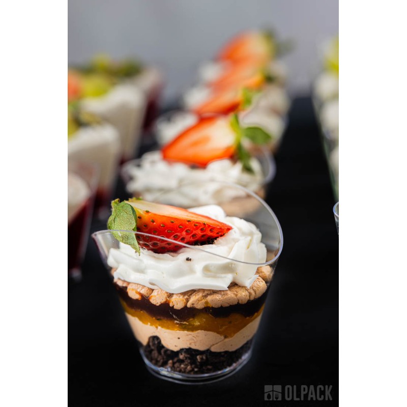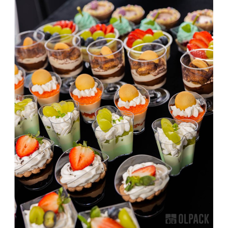Przezroczyste pojemniczki deserowe fala finger food to eleganckie, szkło-podobne, bezbarwne kubeczki degustacyjne stworzone z myślą o profesjonalnym cateringu i efektownej prezentacji potraw. Falująca linia ścianek podkreśla warstwowe kompozycje i sprawia, że każdy podawany deserek wygląda wyjątkowo. To praktyczne i eleganckie pojemniki plastikowe na desery i przekąski, które świetnie sprawdzą się w cukierniach, sklepach oraz na bankietach, weselach i eventach degustacjach.