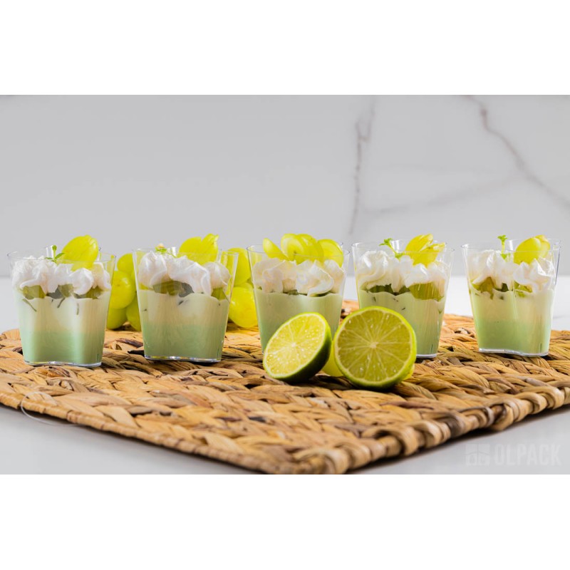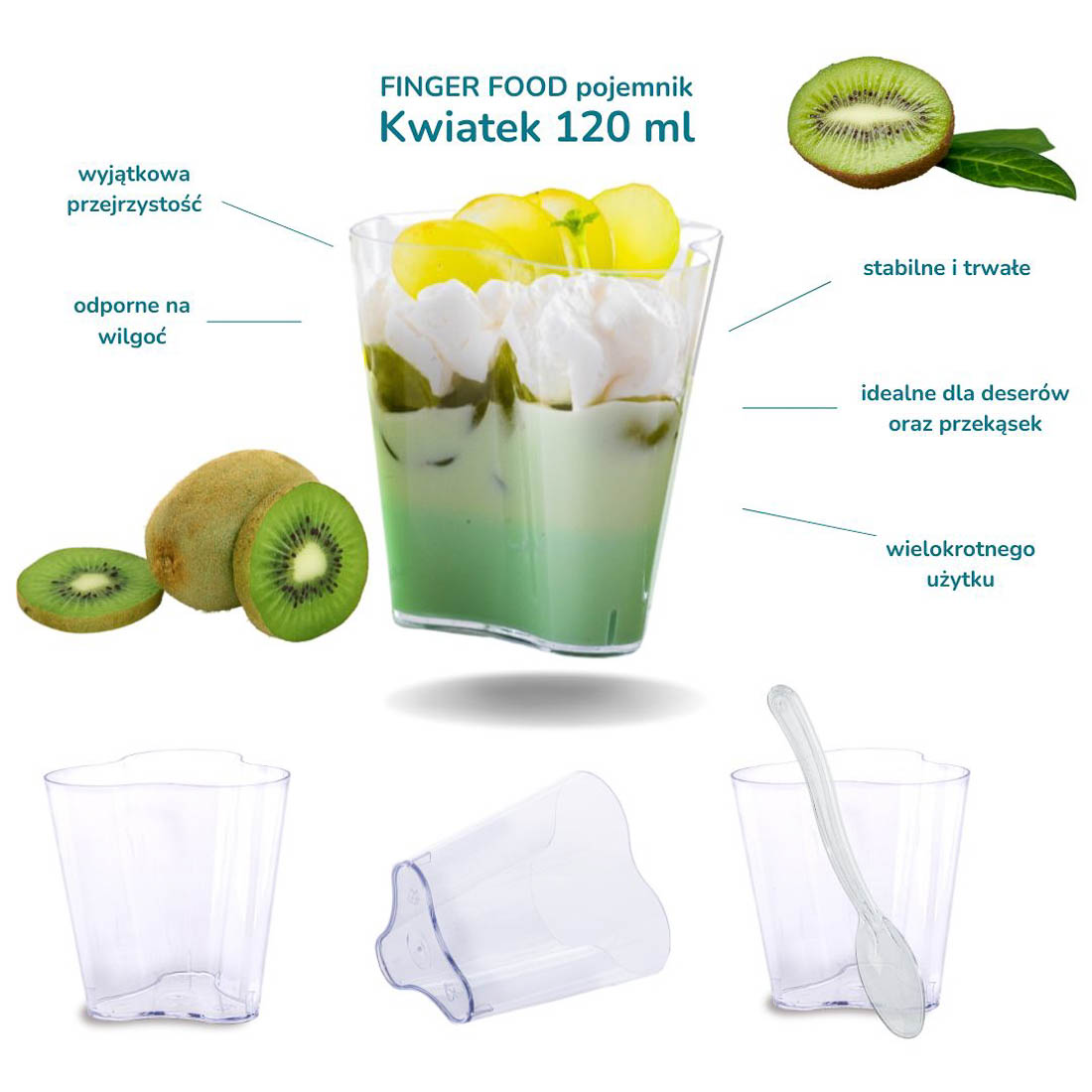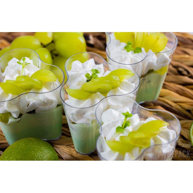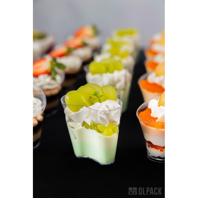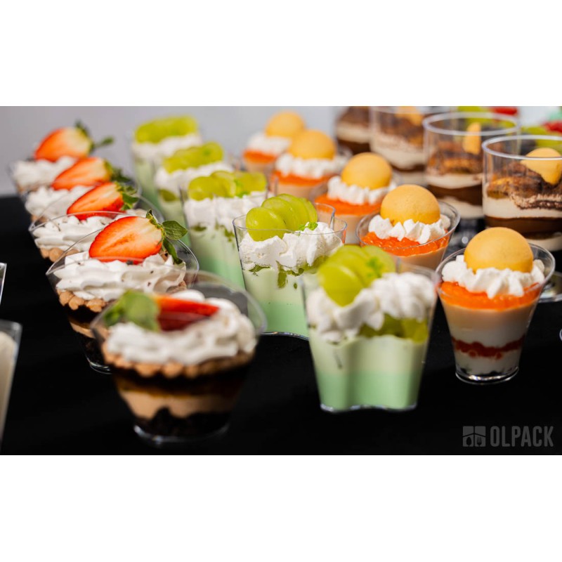 Pojemniczki finger food kwiatek 120 ml świetnie sprawdzają się do serwowania musów, kremów, panna cotty, tiramisu, sałatek, przystawek i przekąsek typu finger food. Firma Olpack oferuje również akcesoria idealnie dopasowane do plastikowych pojemników deserowych: zestawy pojemniczek + pokrywka + łyżeczka, a także - drewniane łódeczki na przekąski oraz ozdobne patyczki do koreczków.