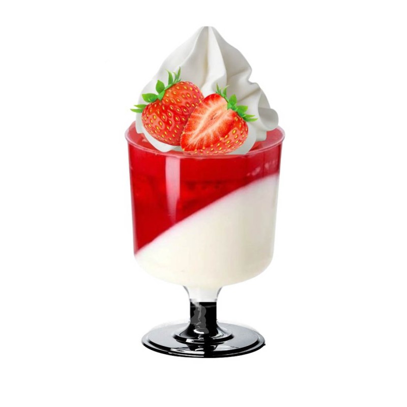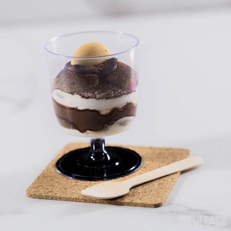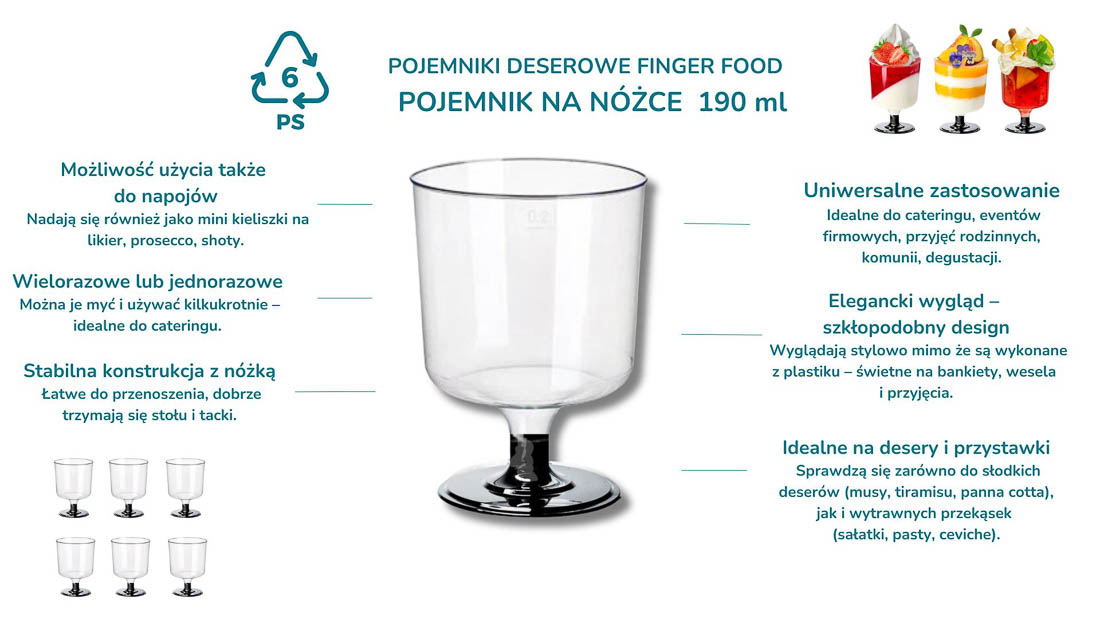 Przezroczysty kubeczek degustacyjny finger food na czarnej nóżce 190 ml idealnie sprawdza się do serwowania musów, kremów, deserów warstwowych. To praktyczne i estetyczne rozwiązanie wszędzie tam, gdzie liczy się profesjonalna, spójna prezentacja deserów i przekąsek. Firma Olpack oferuje również akcesoria idealnie dopasowane do plastikowych pojemników deserowych: zestawy pojemniczek + pokrywka + łyżeczka, a także - drewniane łódeczki na przekąski oraz ozdobne patyczki do koreczków.