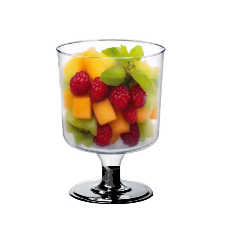 Plastikowy deserowy pojemnik finger food 190 ml na czarnej nóżce to elegancki, plastikowy pucharek deserowy stworzony z myślą o profesjonalnej gastronomii. Czarna nóżka dodaje mu elegancji i sprawia, że całość wygląda jak mały kieliszek degustacyjny. Pucharek na mini deserki wykonany jest z wysokiej jakości polistyrenu (PS) przeznaczonego do kontaktu z żywnością, zgodnie z wymaganiami przepisów unijnych.