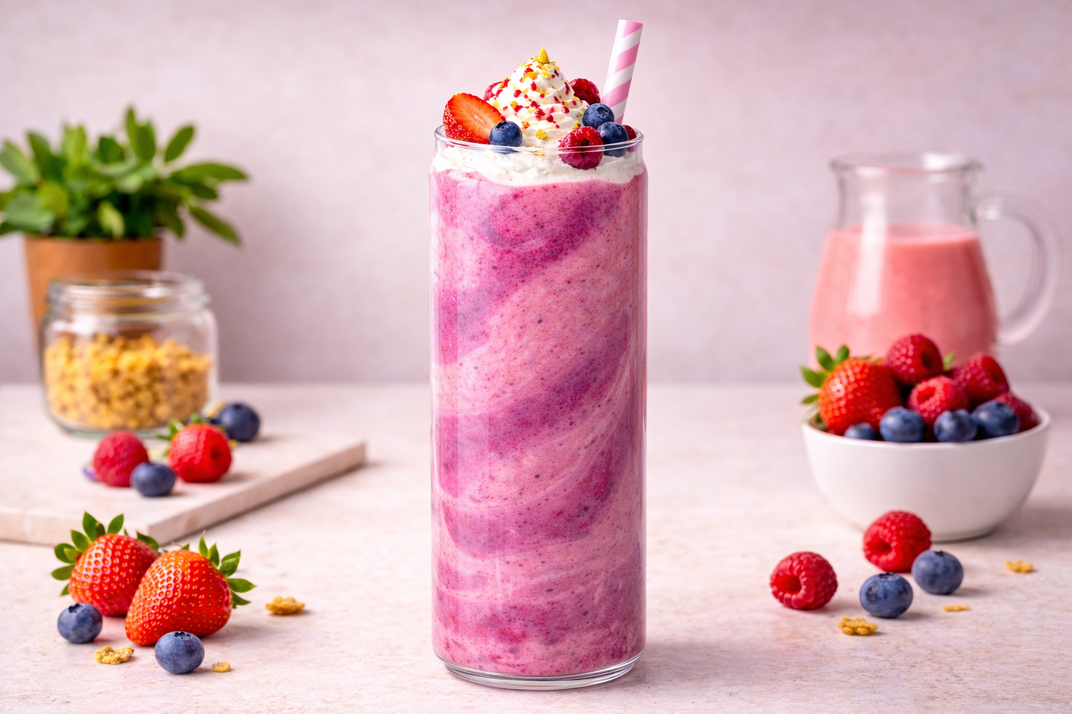 Transparentna puszka plastikowa PET do napojów doskonale eksponuje zawartość. Przezroczysty materiał podkreśla naturalny kolor napoju, widoczne kawałki świeżych owoców oraz efektowne warstwy składników, dzięki czemu produkt prezentuje się wyjątkowo atrakcyjnie i apetycznie.
