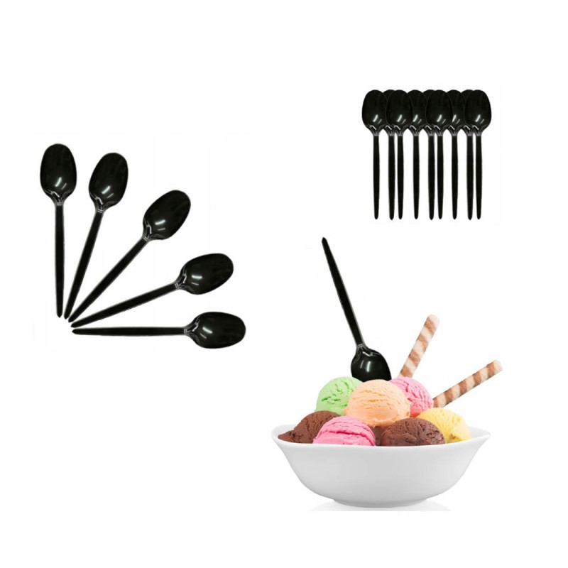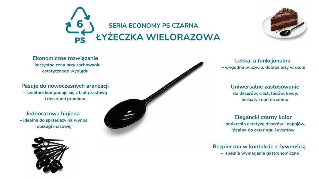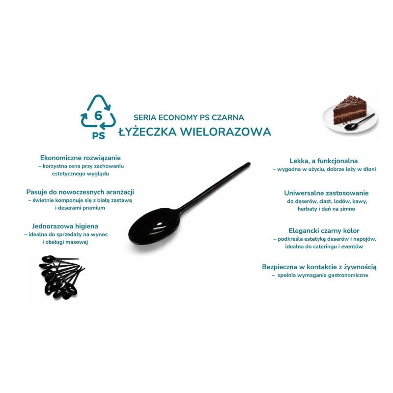 Czarne łyżeczki wielokrotnego użytku z serii ECONOMY to wielorazowe sztućce deserowe z polistyrenu (PS). Smukły kształt ułatwia mieszanie i nabieranie, a elegancka czerń dobrze wygląda w strefach kawowych i cukierniczych. Zastosowany PS jest materiałem przeznaczonym do kontaktu z żywnością, zgodnym z prawem unijnym i nadającym się do recyklingu.