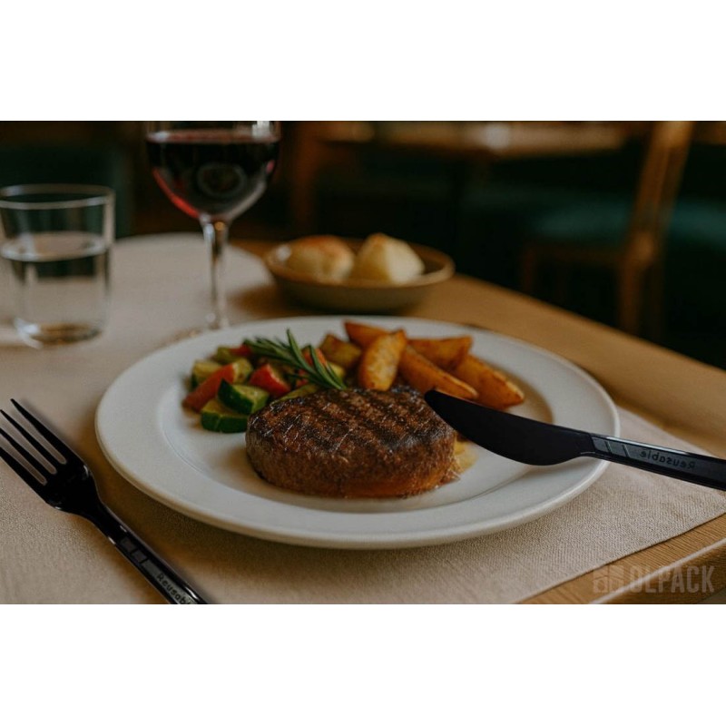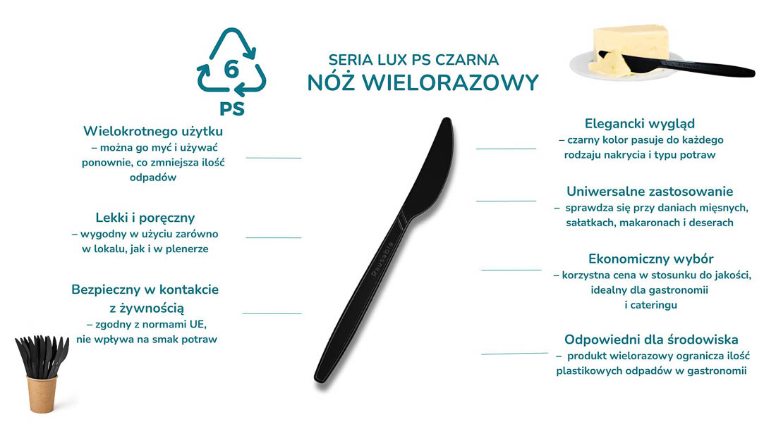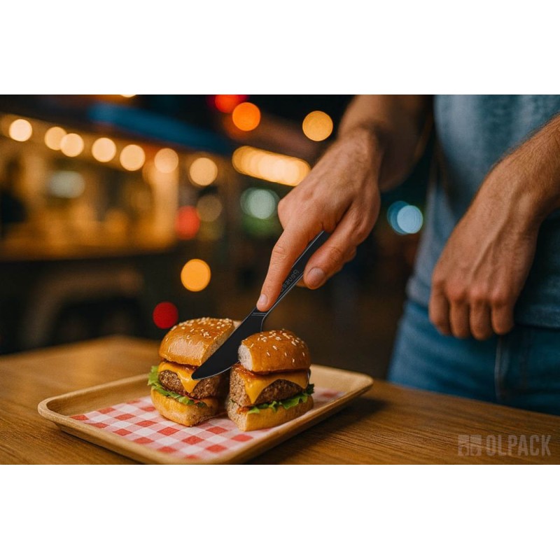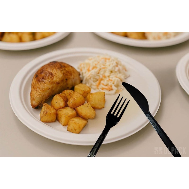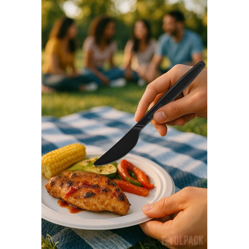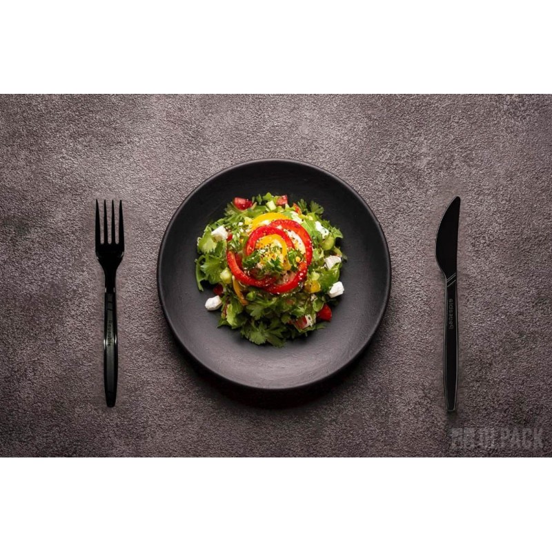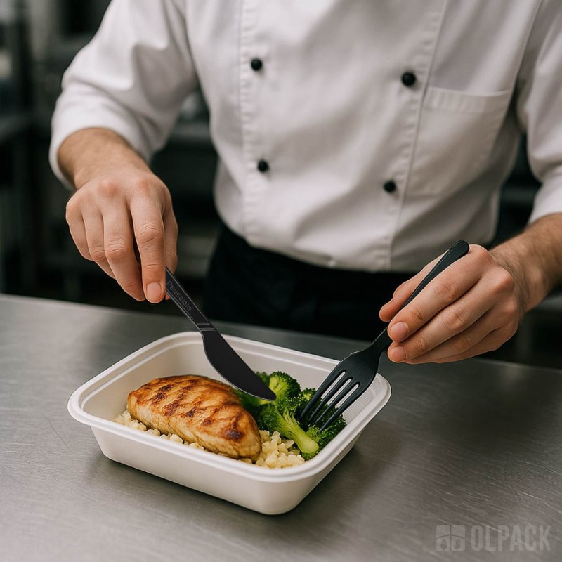 Czarny nóż świetnie sprawdzi się w duecie z lunchboxem z trzciny cukrowej, tworząc estetyczny i ekologiczny zestaw do dań na wynos. Będzie także doskonałym uzupełnieniem pojemników na sałatki, zapewniając wygodne krojenie składników i komfort podczas jedzenia.