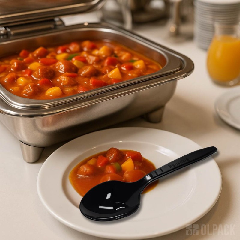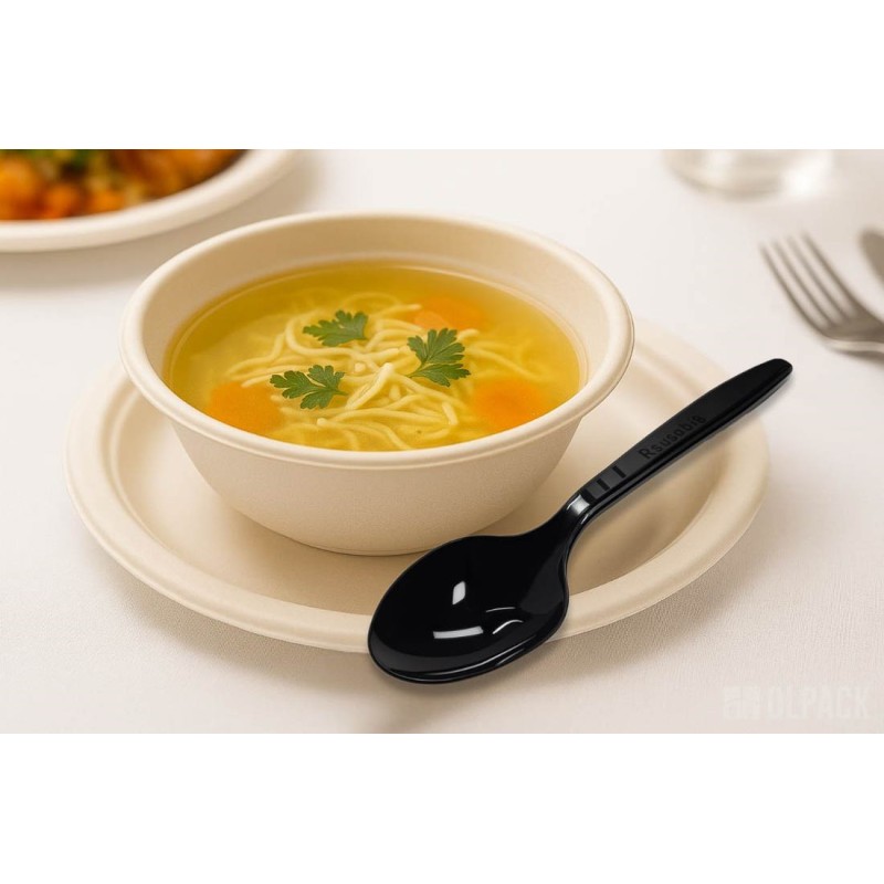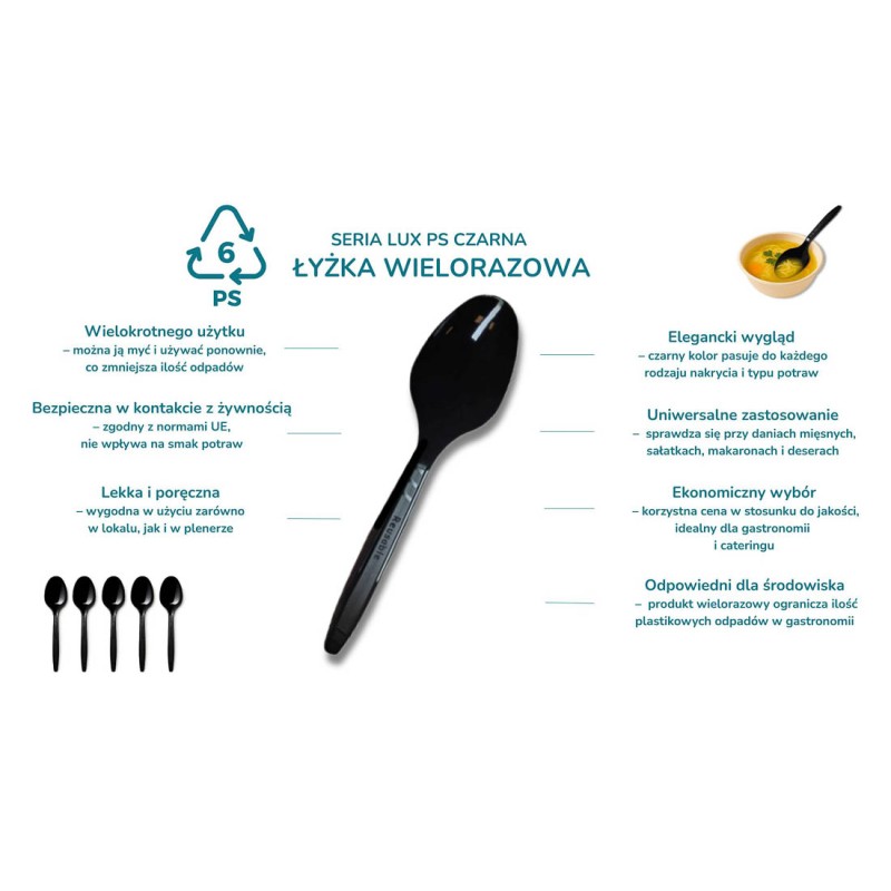Czarne łyżki wielorazowe LUX o długości 178 mm wykonane są z wysokiej jakości polistyrenu (PS) o zwiększonej grubości i sztywności. Stabilna konstrukcja zapewnia komfort użytkowania oraz odporność na odkształcenia podczas serwowania dań gorących i zimnych. Materiał jest bezpieczny w kontakcie z żywnością, spełnia wymagania Unii Europejskiej i może być poddawany recyklingowi, co czyni produkt odpowiednim dla gastronomii i cateringu.