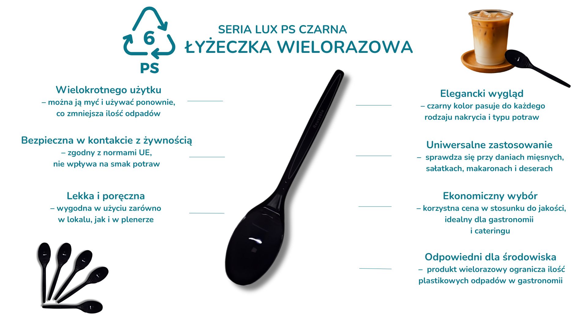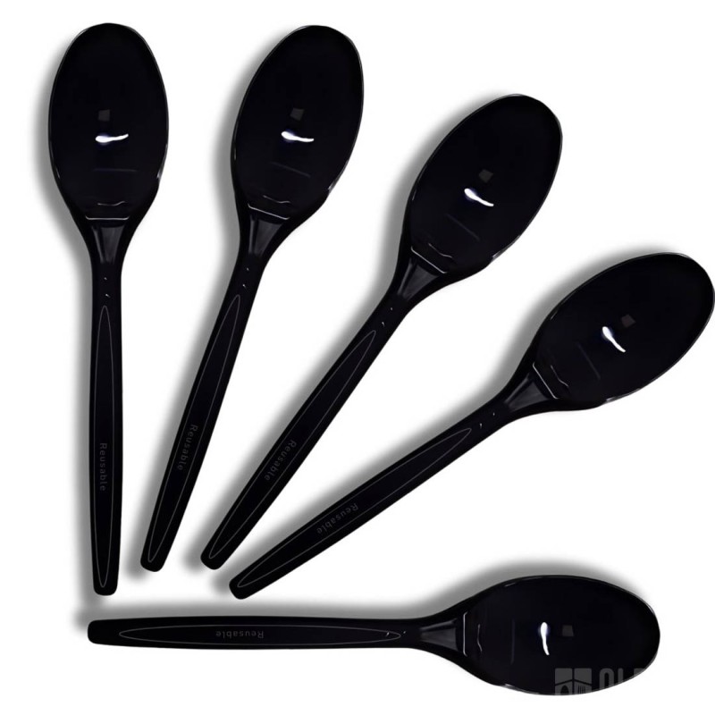 Czarne łyżeczki plastikowe wielokrotnego użytku LUX wykonane są z polistyrenu (PS) i mają długość 145 mm. Materiał ten jest dopuszczony do kontaktu z żywnością, spełnia wymogi UE i dodatkowo nadaje się do recyklingu.