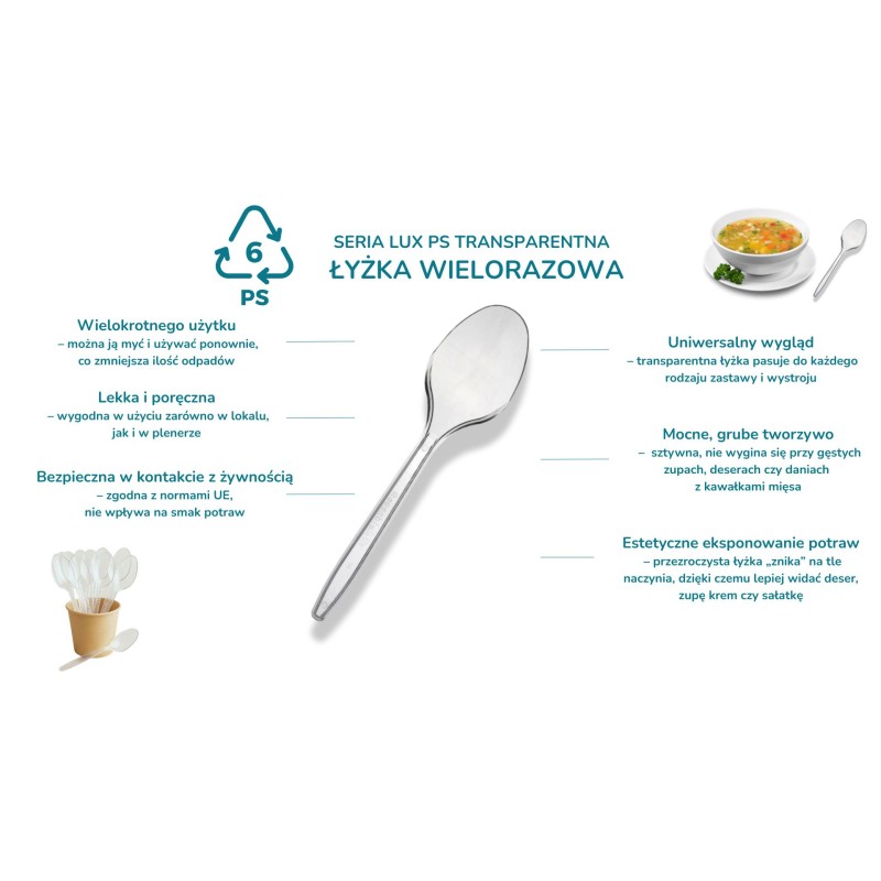 Transparentne łyżki wielokrotnego użytku LUX o długości 178 mm wykonane są z twardego polistyrenu (PS). Grube, stabilne tworzywo sprawia, że łyżka jest sztywna, wygodnie leży w dłoni i nie odkształca się podczas nabierania zup, dań jednogarnkowych czy deserów.