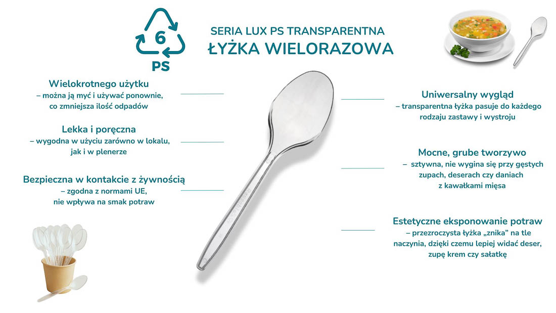 Polistyren użyty do produkcji jest materiałem dopuszczonym do kontaktu z żywnością, spełnia wymagania przepisów UE i nadaje się do recyklingu. Dzięki temu łyżki są praktycznym oraz bezpiecznym wyborem dla lokali, które szukają trwałych sztućców z tworzywa z możliwością ponownego przetworzenia po zakończeniu użytkowania.